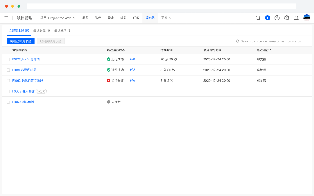 集成Jenkins服务,获取Jenkins中的流水线信息,支持将流水线关联到对应的项目或迭代,追踪研发进度。