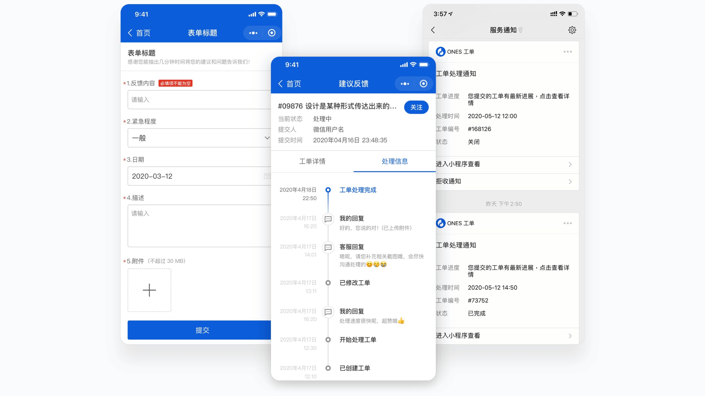 ONES Desk 工单小程序 一键提单,实时掌握处理进度,自动获取处理结果。
