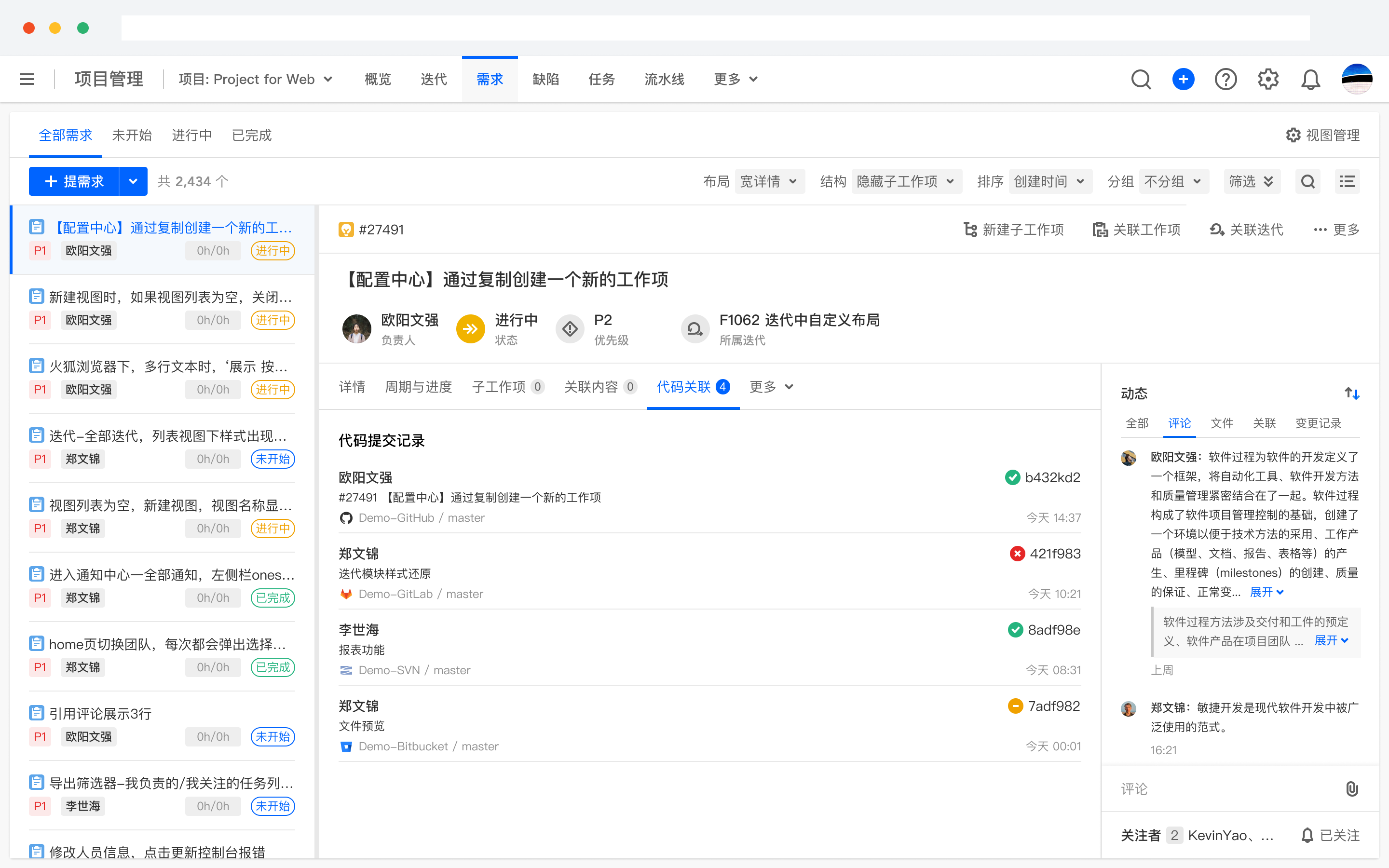 在项目、迭代、需求中,可视化代码提交、流水线构建、产品发布等 CI/CD 过程,帮助团队以清晰、直观的方式管理和追踪研发过程,以管控风险,提高交付质量。