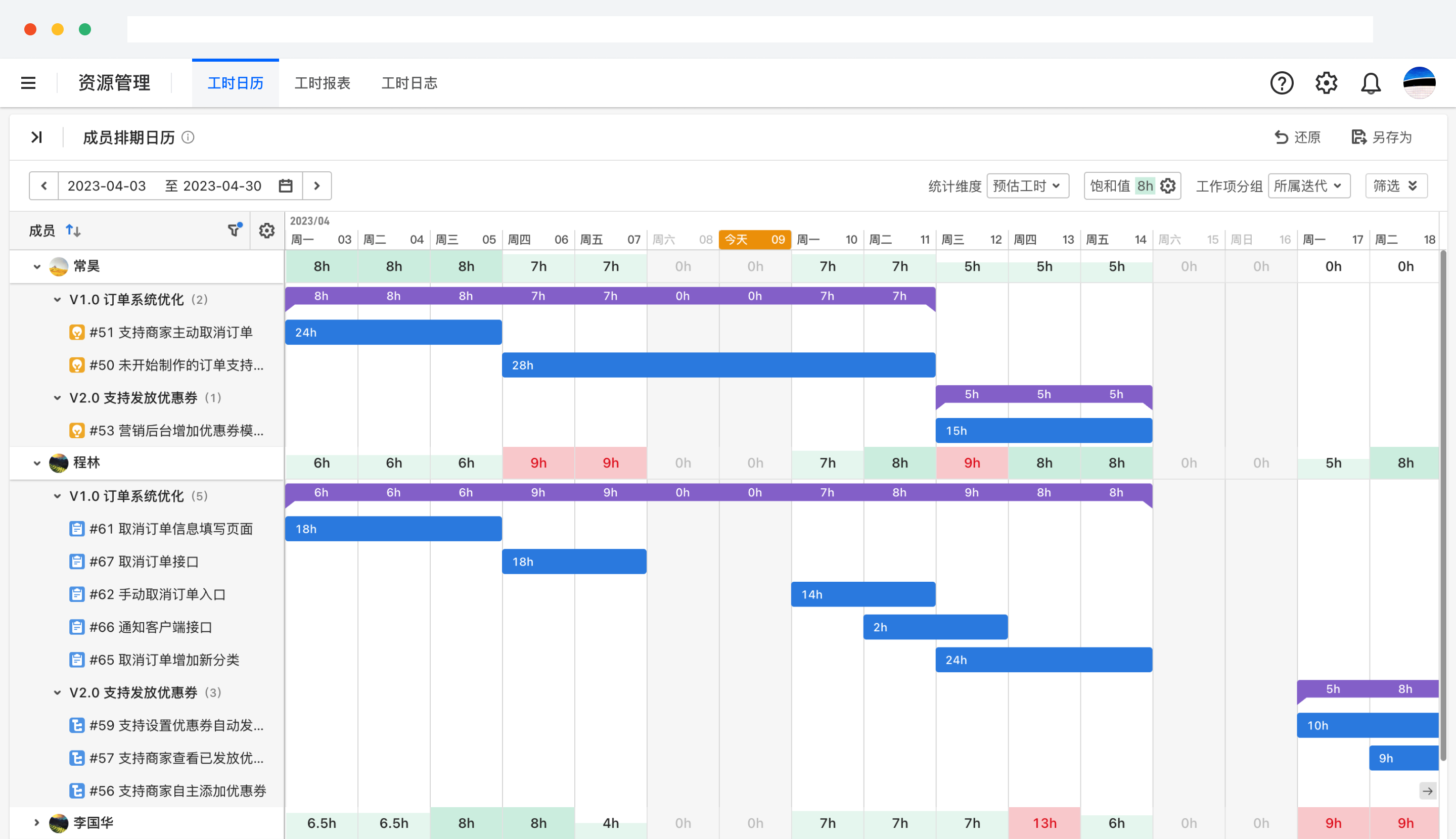 支持查看项目和团队的资源利用率及负荷度,提高资源分配效率。可视化展现团队成员的工作规划情况,帮助管理者合理分派任务。